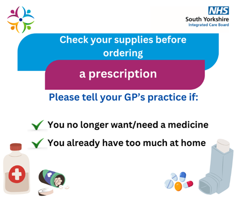 NHS South Yorkshire urges all residents to check their medicines supply before ordering more, and to check their medicines bags before leaving the pharmacy to help protect supply chains and our environment.